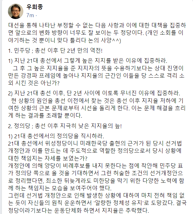 정의당을 지지하는 많은 분들의 순수한 진정성은 인정되지만, 낮은 지지율의 원인은 외부가 아니라 내부에 있다. 기대가 컸던 만큼 노회찬 이후 너무 안타까운 정당이 되었다.
