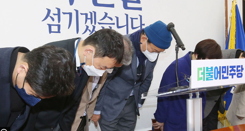 셋째는 강성 지지층 때문이다. 정확히는 일부 강성 지지층만 바라보고 정치적 이익을 챙기려고 하는 소수의 정치인들 때문이다. 지난 몇 년 동안 민주당 안팎에선 정치적 체급을 키우는 '공식' 같은 것이 있어왔다. 온갖 개혁과 적폐 청산을 외치며 극단에 가까운 목소리를 내면 일부 강성 지지자들의 성원을 등에 업고 공천도 받고, 최고위원도 될 수 있었다. 빚을 지면 갚아야 하기에 그들은 강성 지지자들의 과대 대표된 목소리를 대변했고 그때마다 민주당은 실제 민심과 거꾸로 갔다. 지난해 4.7재보선 참패 이후 민주당 서울시당이 자체 실시한 집단심층면접조사(FGI) 보고서에서 면접참여자의 대다수가 '조국 사태'를 패인으로 꼽았지만 일부 의원들은 여전히 '조국 수호'를 외치기에 여념이 없었다. 그런 일부 국회의원들의 목소리가 커질수록 민주당의 정당 지지도는 하락했다. 그러나 강성 지지층이 영향을 미치는 범위는 당내 선거에 국한된다. 전국 단위 선거에서 중도 표심이 캐스팅 보트가 아니었던 적은 단 한 번도 없다. 민주당의 이번 대선 메시지는 '사과'로 압축된다. 대선이 가까워질수록 큰절도 올리고 사과를 거듭했지만 결과를 뒤집기엔 너무 늦었던 걸로 판명 난 셈이다.