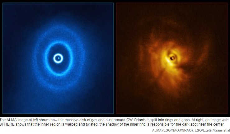 The ALMA image at left shows how the massive disk of gas and dust around GW Orionis is split into rings and gaps. At right, an image with SPHERE shows that the inner region is warped and twisted; the shadow of the inner ring is responsible for the dark spot near the center.