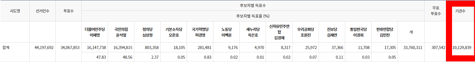 | 지역 | 더불어민주당 이재명 후보 | 국민의힘 윤석열 후보 |