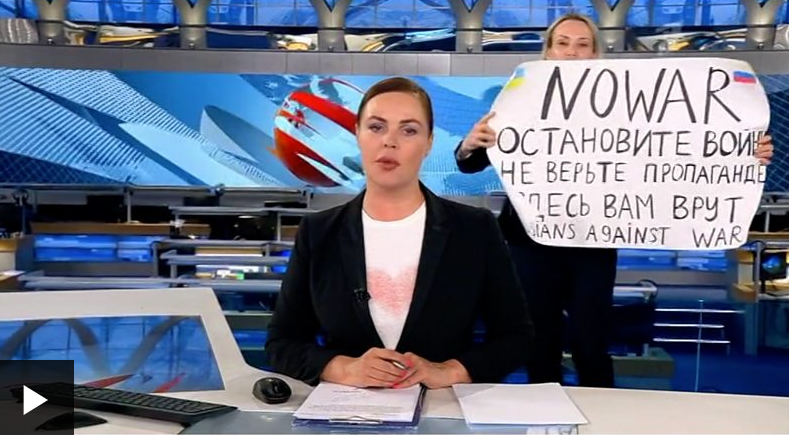 Images of Ms Ovsyannikova's protest were quickly shared across the world after she ran on to the set of one of Russia's most-watched news programmes, Vremya, holding a sign reading "No war, stop the war, don't believe the propaganda, they are lying to you here."