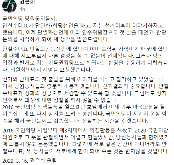 권 원내대표는 이날 페이스북에 글을 올려 “안철수 대표 단일화 공동선언에 합당이 이미 포함된 사항이기 때문에 합당에 대해 지도부로서 다른 결정을 할 수 없음이 전제된다”며 “그러나 당의 입장과 별개로 저는 기득권 양당으로 회귀하는 합당을 수용하기 어렵다.
