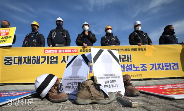 노동부 통계에 따르면 지난 1월27일 중대재해처벌법 시행 이후 한 달간 산재 사고로 사망한 노동자는 42명이다. 현대엘리베이터 현장에서만 2019년 이후 8건의 노동자 사망사고가 발생했다.