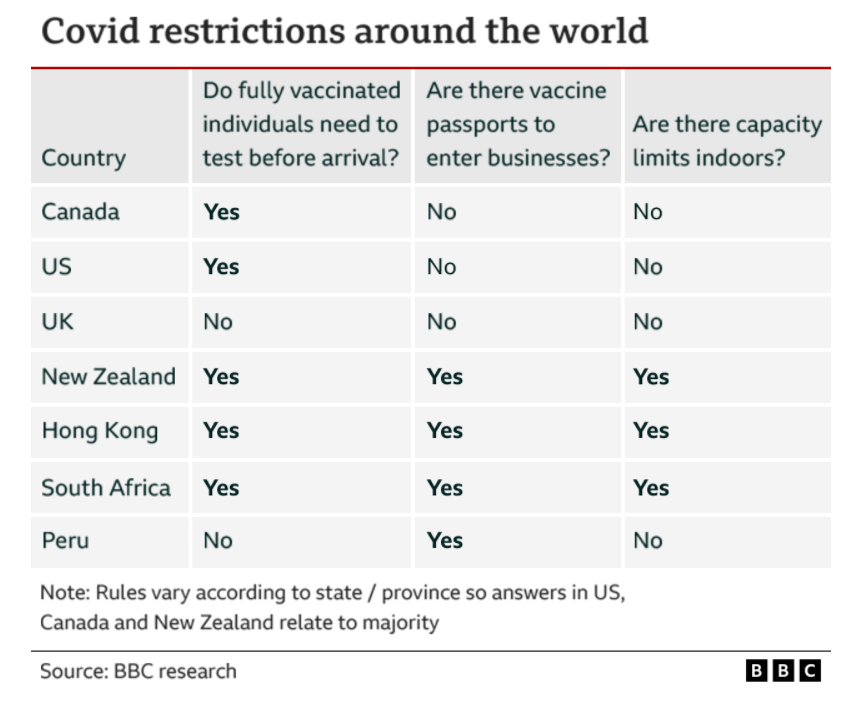A table that let's people know about Covid restrictions around the world