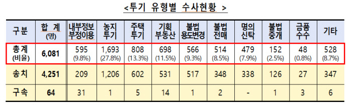 투기 유형별 단속 결과를 보면, LH 사태를 촉발한 내부정보 부정이용 사범은 595명으로 전체의 9.8%를 차지했다. 농사 계획 없이 농지를 매입한 농지 투기사범이 1693명(27.8%)으로 가장 많았고, 부정청약 등 주택투기 사범 808명(13.3%), 기획부동산 사범 698명(11.5%)이었다.