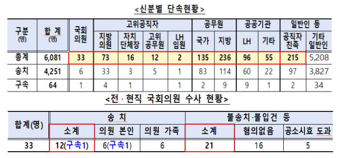 수사 대상은 6081명 중 일반인이 5208명(85.6%)으로 대다수를 차지했다. 전·현직 국회의원은 33명(0.6%)이 포함됐다. 자치단체장 등 고위공직자는 103명(1.7%), 공무원 371명(6.1%), LH 직원 등 공공기관 151명(2.5%), 공직자 친족 215명(3.6%) 등이었다.