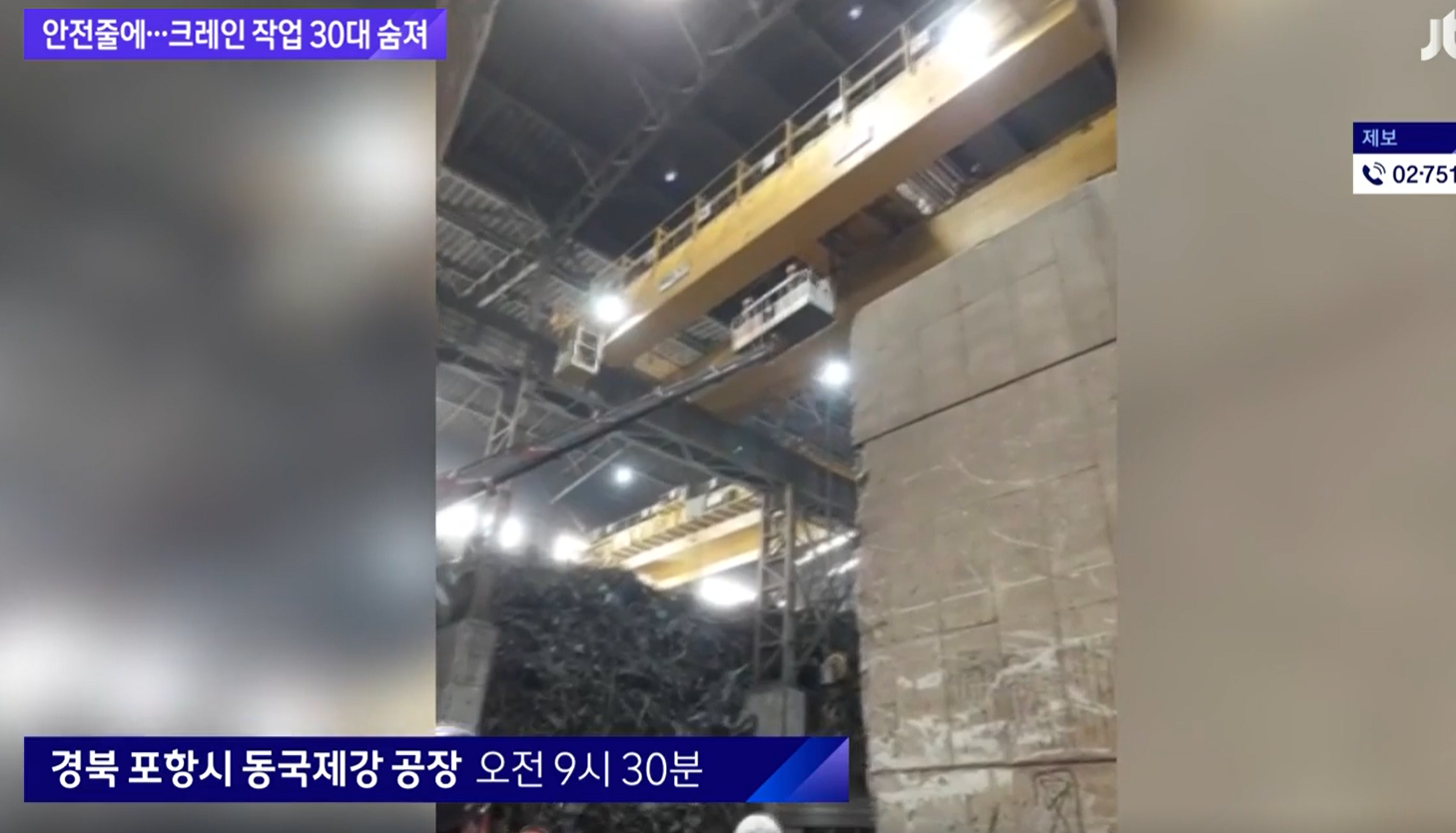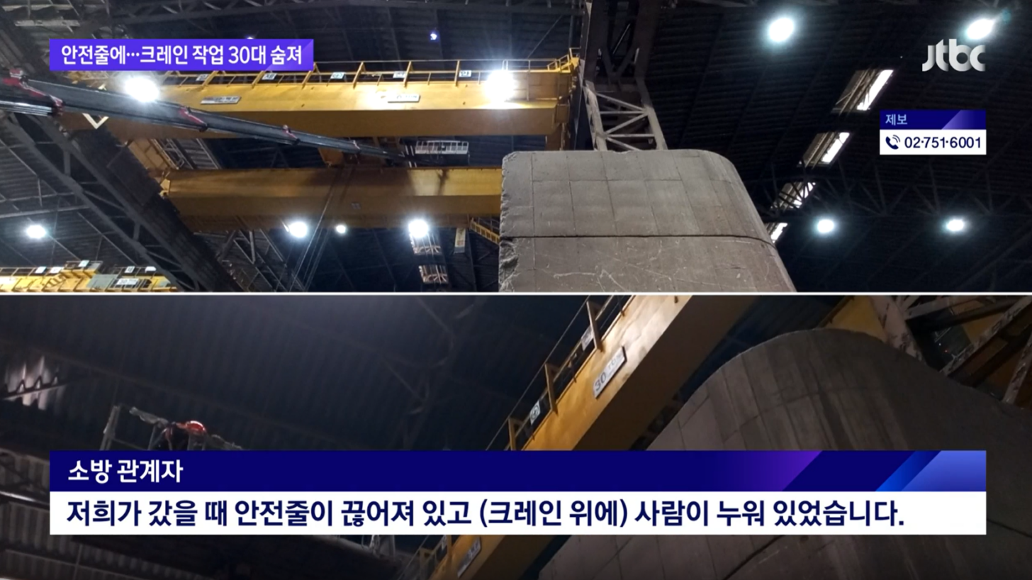 경북 포항의 한 공장에서 30대 노동자가 일하다 숨졌습니다. 추락을 막으려는 안전줄에 오히려 몸이 감겼습니다.