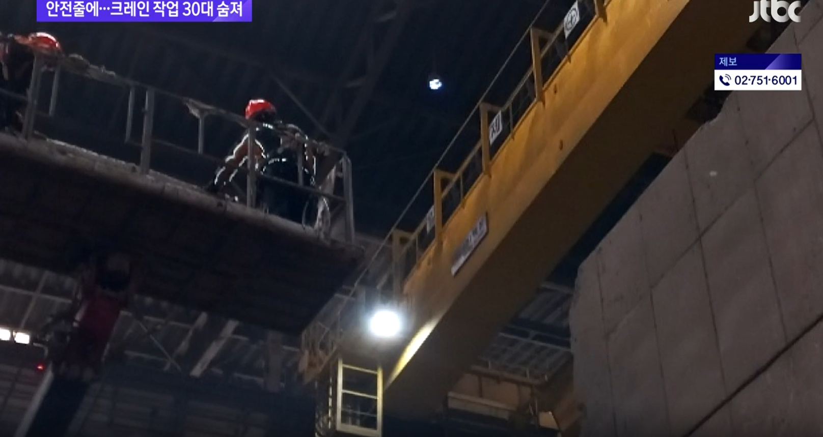 노란 크레인 위에서 38살 노동자 A씨가 작업을 하다 안전줄에 몸이 감겨 숨졌습니다.