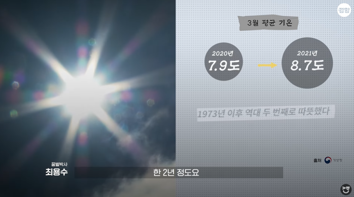 이는 통계로도 확인된다. 2년 전인 2019년 12월~2020년 2월 전국 평균 기온은 3.1도로 1973년 이후 가장 높았다. 높은 기온은 3월까지 이어졌다. 3월 전국 평균 기온이 7.9도로 역대 2위였다. 2020년 3월27일, 기상청에서는 서울 벚꽃이 1922년 벚꽃 관측을 시작한 이래 가장 빨리 폈다는 보도자료를 냈다. 하지만 그 기록은 1년 뒤 경신됐다. 2021년 3월에도 이상고온 현상이 나타났다. 전국 평균 기온이 8.7도로 역대 가장 더운 3월이었다. 벚꽃은 1년 전보다 사흘 빨리 개화했다.