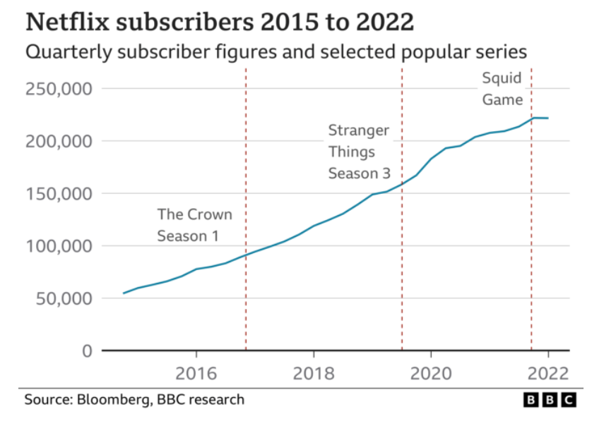 Netflix remains the world's leading streaming service with more than 220 million subscribers. It is increasingly producing its own content and shows such as the Crown, Bridgerton and Squid Game have been global hits.