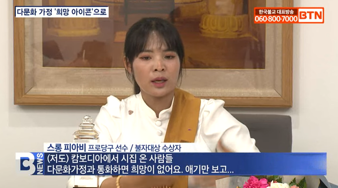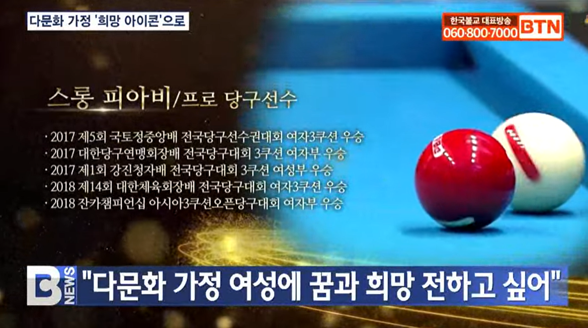올해의 불자대상에 쇼트트랙 국가대표 최민정 선수 등 다섯 명이 선정돼 수상한 것 기억하시죠? 이 가운데 유일한 외국인 수상자가 바로 스롱 피아비 프로 당구선수인데요. 스롱 피아비 선수가 남다른 수상소감을 밝혀 화제입니다. 이은아 기자가 보도합니다.