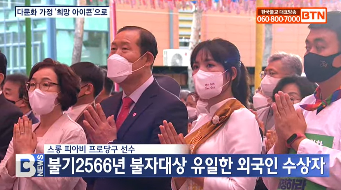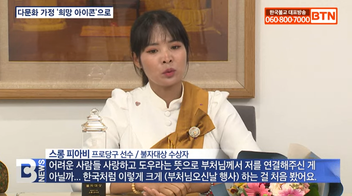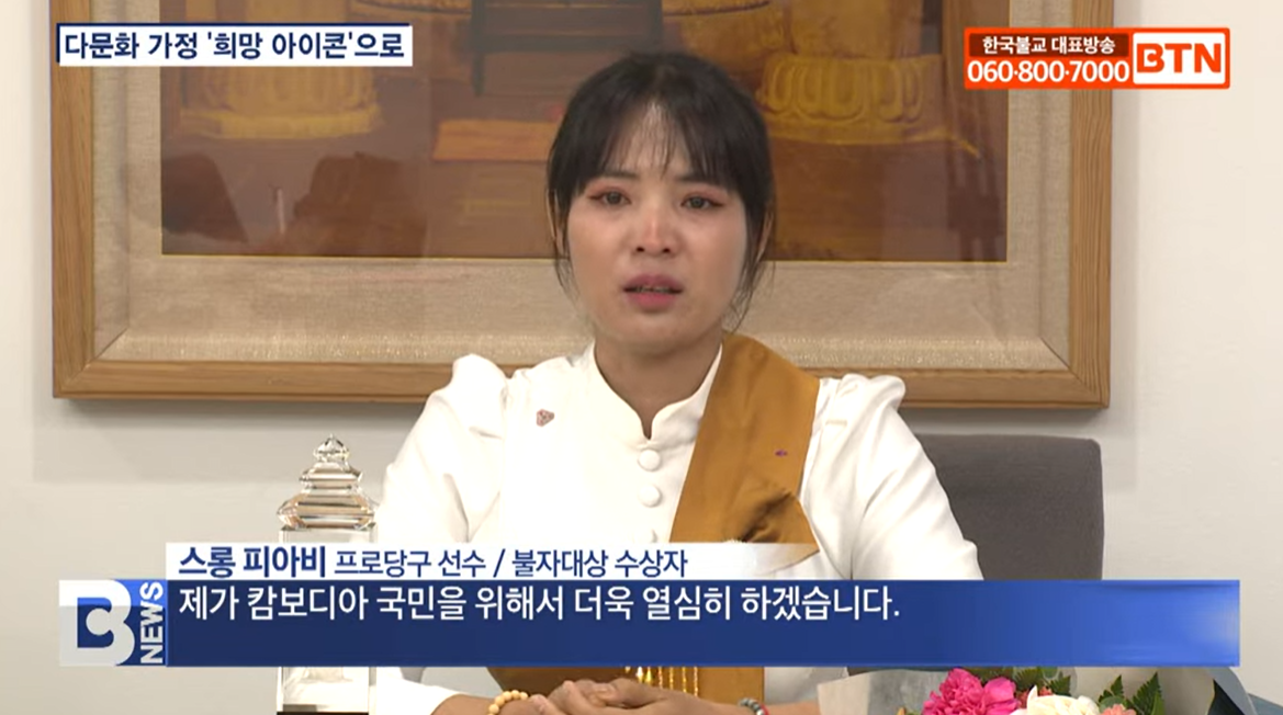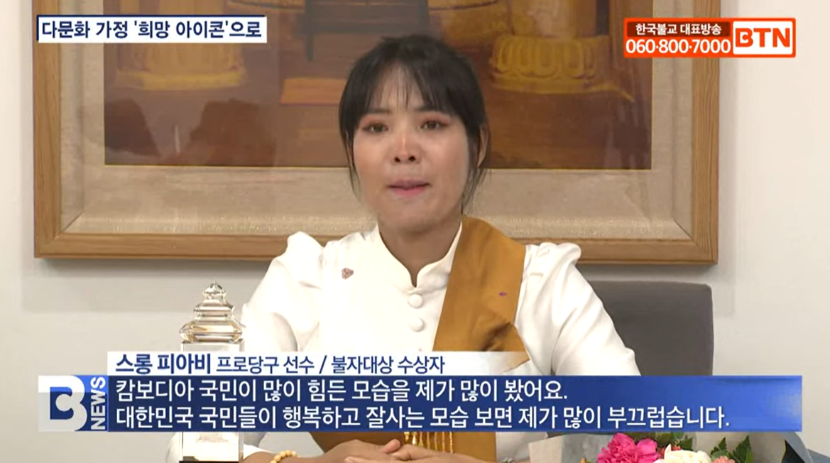스롱 피아비 선수는 캄보디아 스포츠 영재 교육을 위해 부지를 마련했다고 밝혔으며 불자대상 수상을 계기로 제2의 조국 대한민국 국민으로 다문화가정에 희망을 전하는 일에 더욱 앞장서겠다며 환하게 웃었습니다.