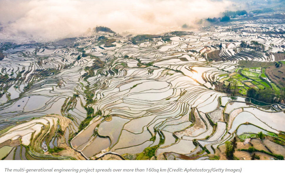 Hacked from mountains in the country's south-western Yunnan province, the sprawling terraces – hundreds of thousands of them – stack up over more than 160sq km to create one of the most spectacular and jaw-dropping landscapes on the planet.