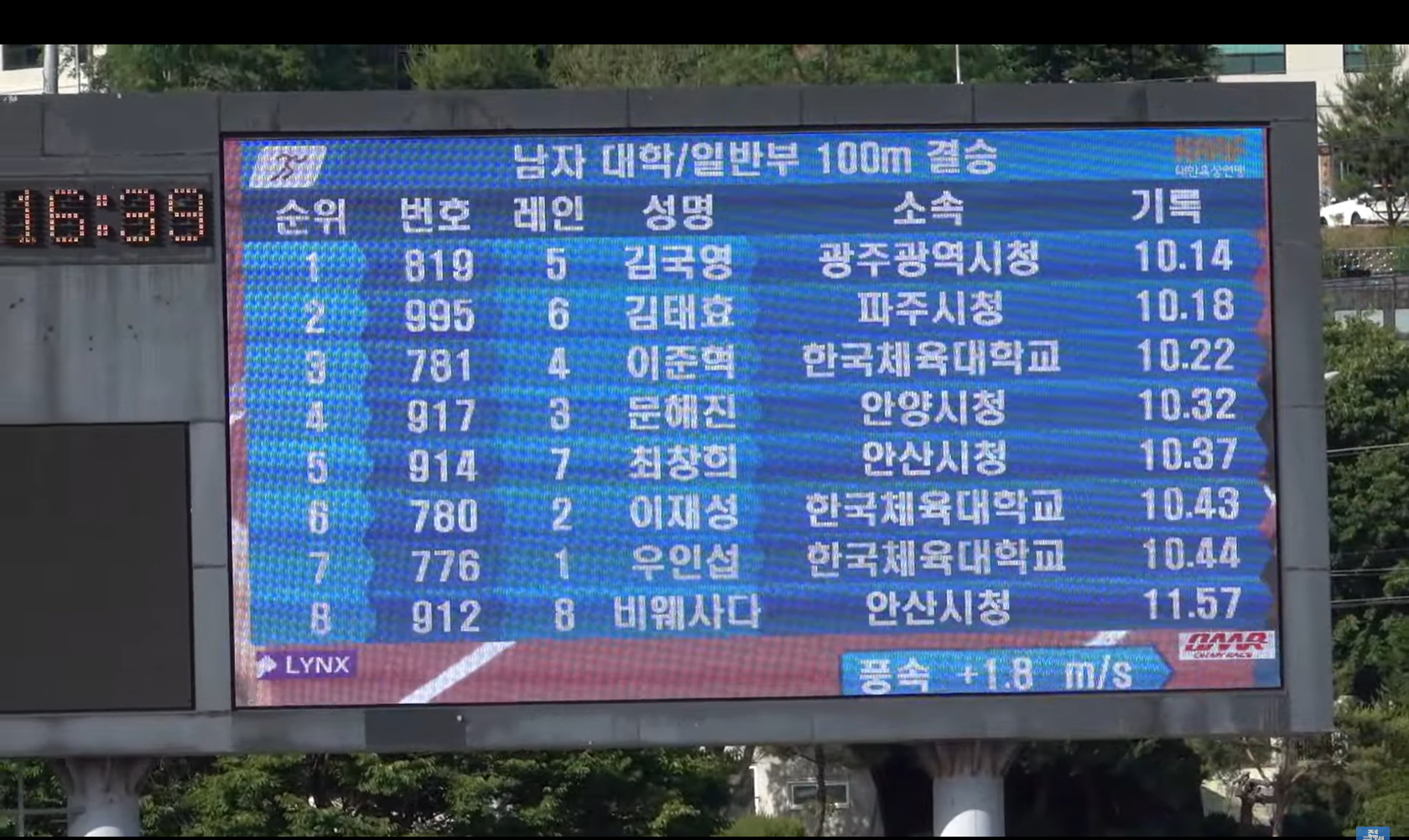남자 대학-일반 100미터 결승. 김국영 10.14, 김태효 10.18
