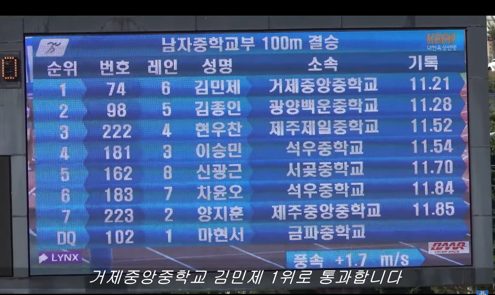 남중 100미터 , 김민제 11.21, 김종인 11.28