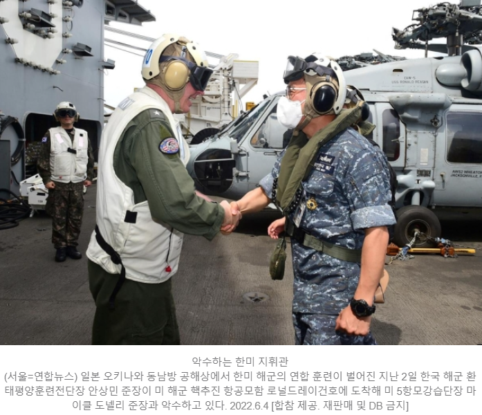 (서울=연합뉴스) 일본 오키나와 동남방 공해상에서 한미 해군의 연합 훈련이 벌어진 지난 2일 한국 해군 환태평양훈련전단장 안상민 준장이 미 해군 핵추진 항공모함 로널드레이건호에 도착해 미 5항모강습단장 마이클 도넬리 준장과 악수하고 있다. 2022.6.4 [합참 제공. 재판매 및 DB 금지]