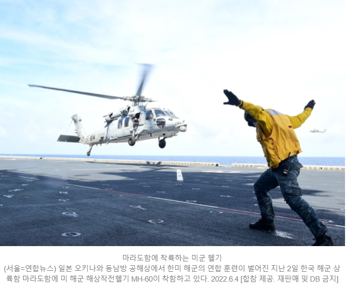 (서울=연합뉴스) 일본 오키나와 동남방 공해상에서 한미 해군의 연합 훈련이 벌어진 지난 2일 한국 해군 상륙함 마라도함에 미 해군 해상작전헬기 MH-60이 착함하고 있다. 2022.6.4 [합참 제공. 재판매 및 DB 금지]