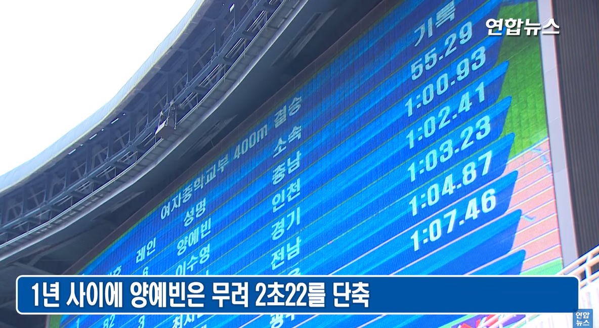 2019년 7월 29일. 양예빈이 중 3이었을 때, 여자 400미터 55초 29로, 29년만에 중학생 기록을 경신한 바 있다.