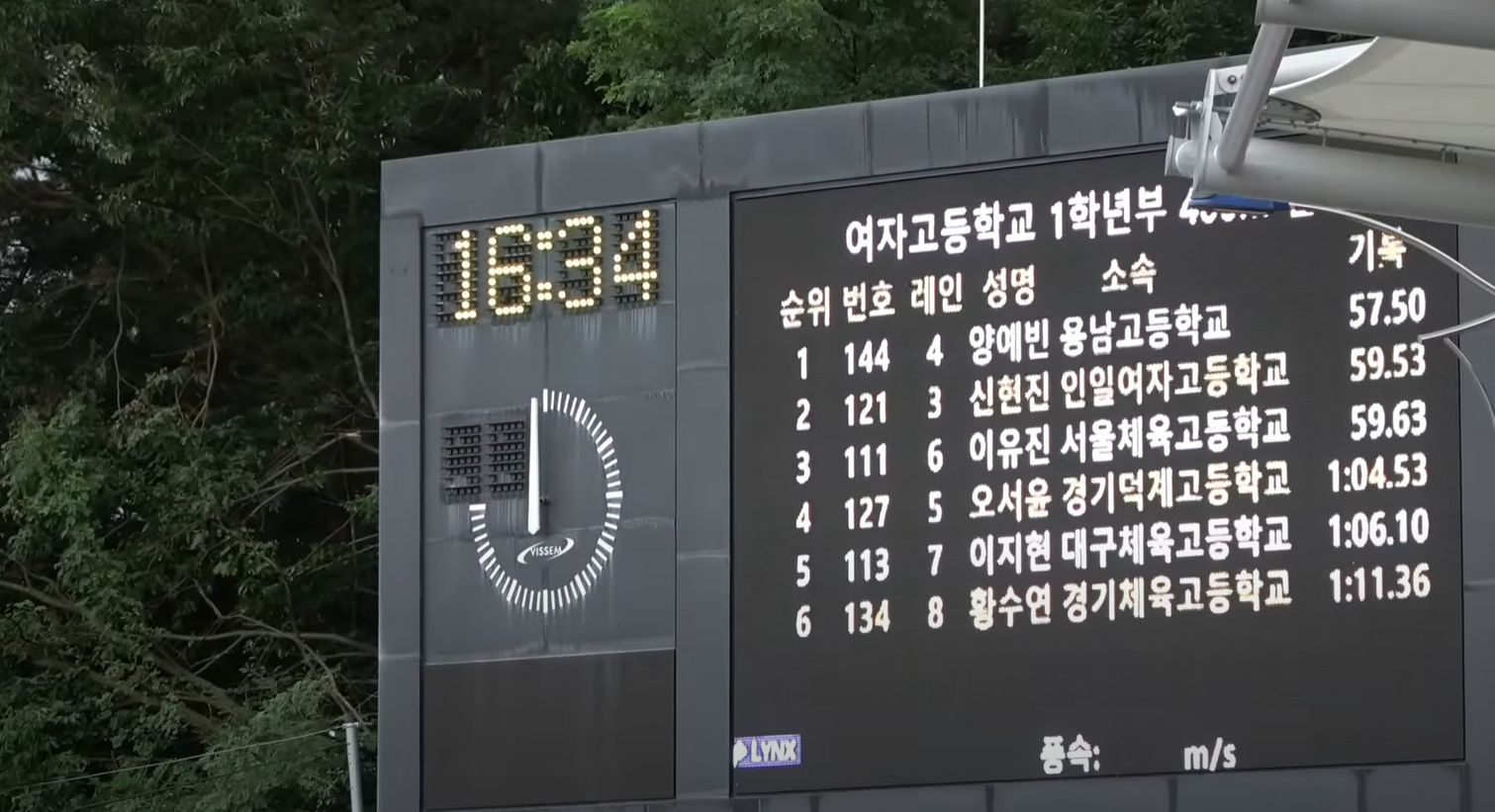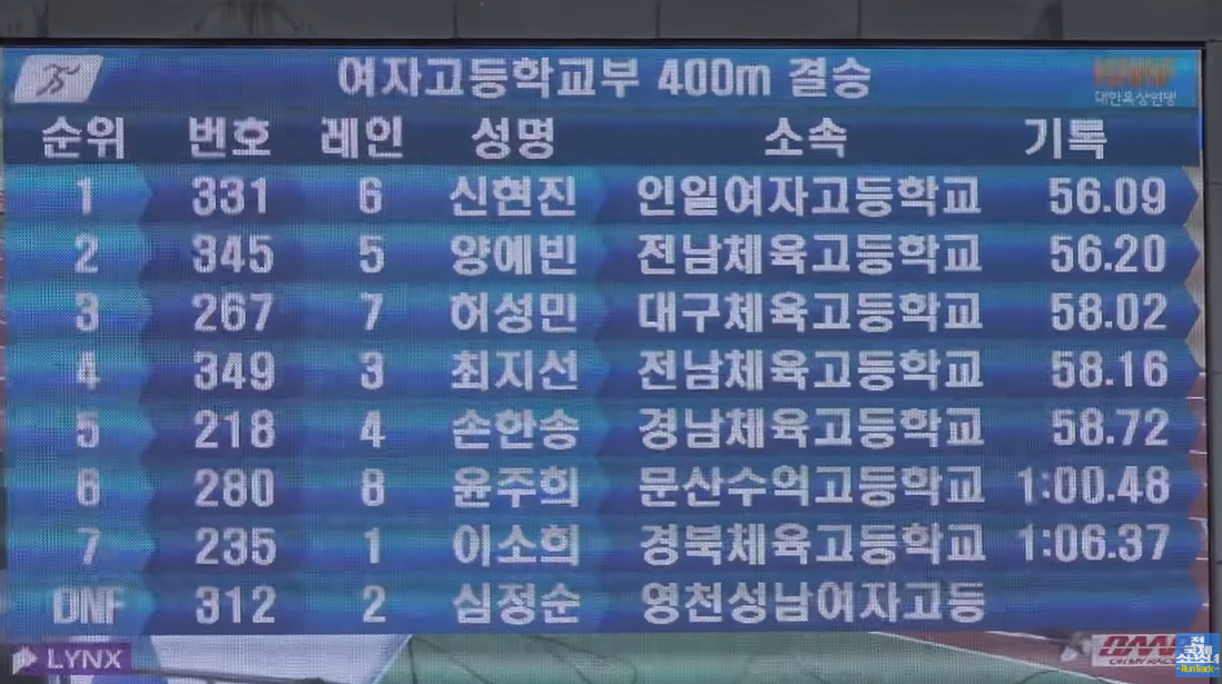 신현진 56.09로, 양예빈 56.20 으로 각각 1위와 2위.