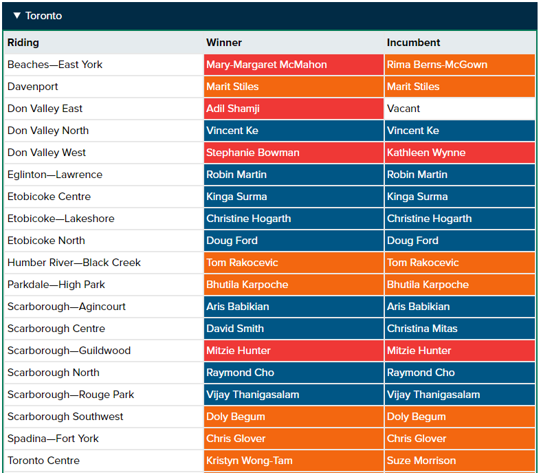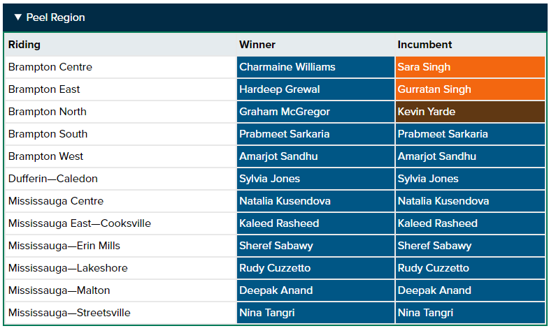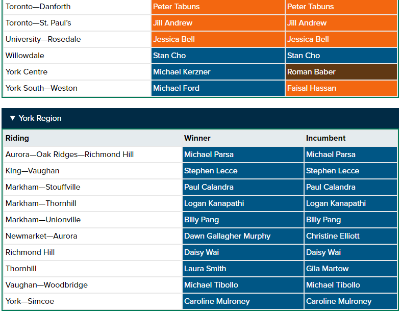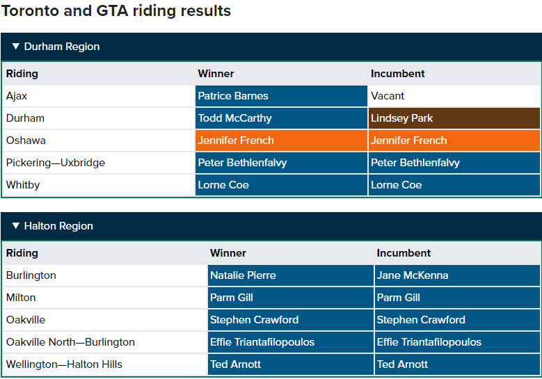 Meanwhile, independent candidate Bobbi Ann Brady was elected in Haldimand-Norfolk, a region Toby Barrett represented for the Progressive Conservatives since 1995. He did not run this time.