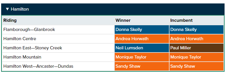 NDP Leader Andrea Horwath again won in Hamilton Centre, a seat she has held since 2004. It was her fourth election as leader after taking the helm in 2009. In an emotional speech to supporters in Hamilton, Horwath said it is time for her to "pass the torch."