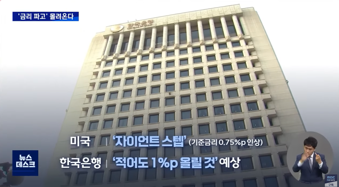 미국이 기준금리를 한꺼번에 0.75% 포인트 올린 '자이언트 스텝'을 단행하면서, 한국은행 역시 연말까지 기준금리를 적어도 1%포인트 더 올릴 것으로 예상되기 때문입니다.