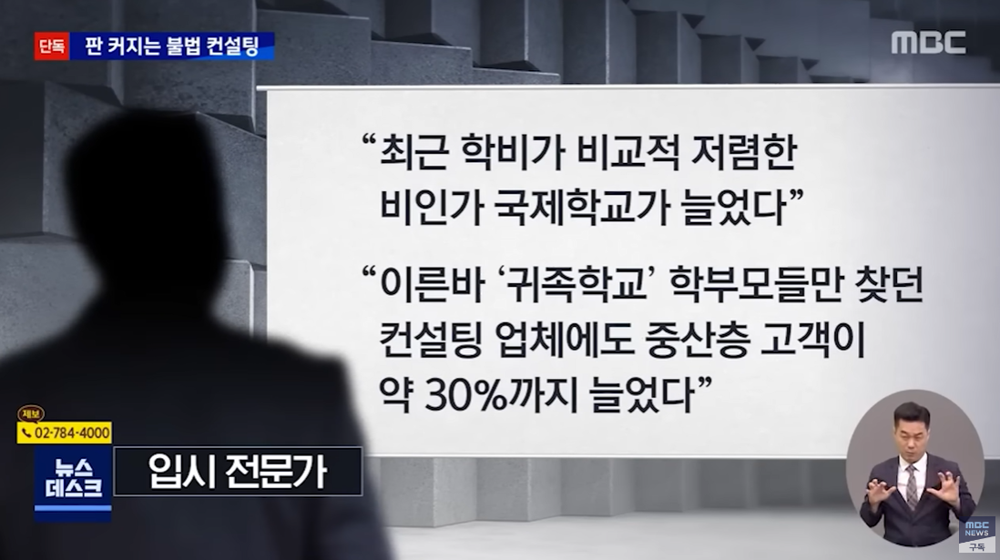 한 입시 전문가는 최근 학비가 비교적 저렴한 비인가 국제학교가 늘면서, 이른바 '귀족학교' 학부모들만 찾던 컨설팅 업체에 중산층 고객이 약 30%까지 늘었다고 말합니다.