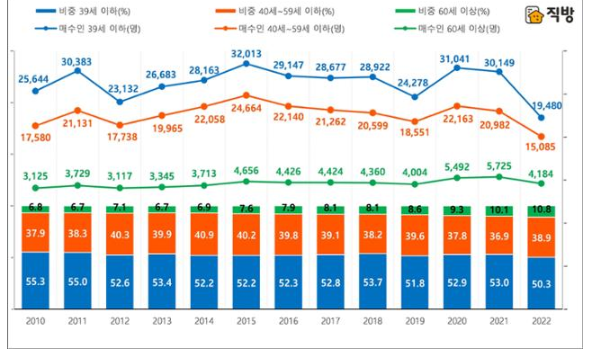 매수자 연령대별로는 전국 모든 연령대가 지난해보다 감소한 것으로 드러났다. 특히 39세 이하는 올해 1만9,480명이 사 들여 통계 발표 이후 처음으로 2만 명 이하를 기록했다. 이들이 차지하는 비중도 50.3%로 역대 최저다. 40~59세 이하는 1만5,085명으로 줄었고, 60세 이상은 4,184명으로 집계됐다.
