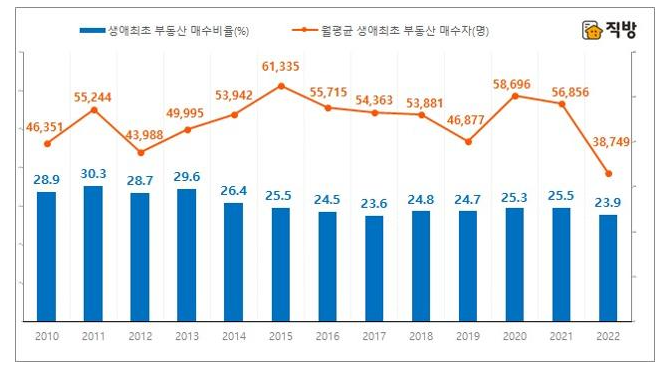 전국 부동산의 월평균 생애 최초 매수자수 및 매수비율 연간 추이. 직방 제공