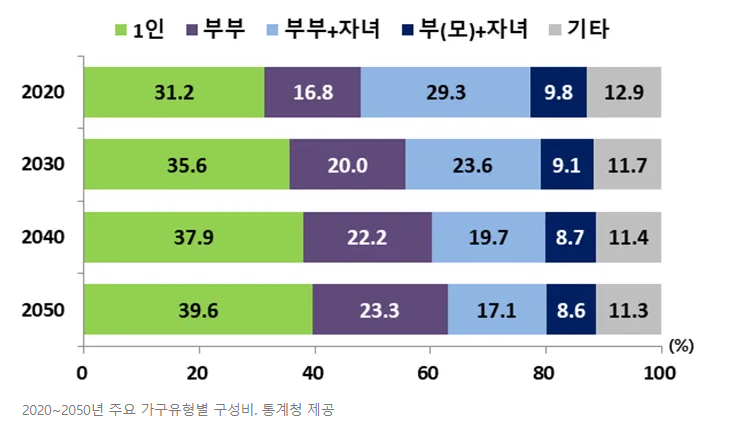 가구 유형별로도 2020년 1인 가구(31.2%) 비중이 가장 높았고 부부와 자녀로 구성된 가구가 29.3%, 부부 가구가 16.8%로 각각 뒤를 이었다. 2050년에는 부부와 자녀 가구가 17.1%로 비교적 큰 폭 줄고 부부 가구도 23.3%까지 감소할 것으로 추계됐다.