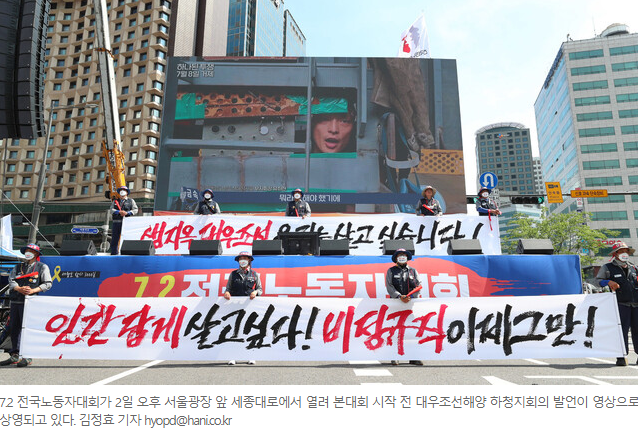 오후 3시부터 시작된 본 대회에서 노동자들은 “노동자는 죽어난다, 노동개악 저지하라”고 외치며 물가폭등 민생대책 마련, 사회 공공성 강화, 국가책임 강화, 비정규직 철폐 등을 요구했다.