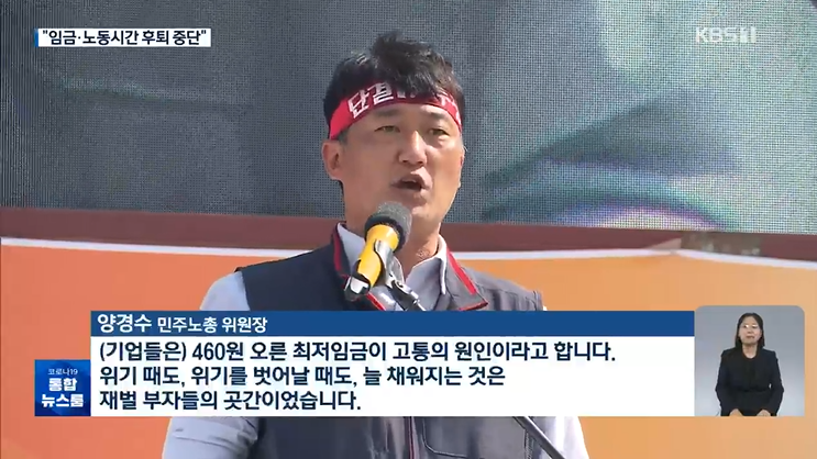 [양경수/민주노총 위원장 : "(기업들은) 460원 오른 최저임금이 고통의 원인이라고 합니다. 위기 때도, 위기를 벗어날 때도, 늘 채워지는 것은 재벌 부자들의 곳간이었습니다."]
