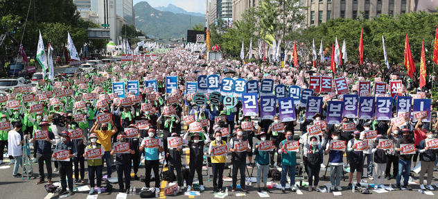 전국민주노동조합총연맹(민주노총)이 2일 세종대로와 을지로 등 서울 도심에서 최저임금 인상과 비정규직 철폐 등을 요구하는 ‘7·2 전국 노동자대회’를 열었다. 이날 집회에 참가한 노동자 3만여명은 용산 대통령실 인근 삼각지 파출소까지 행진했다.