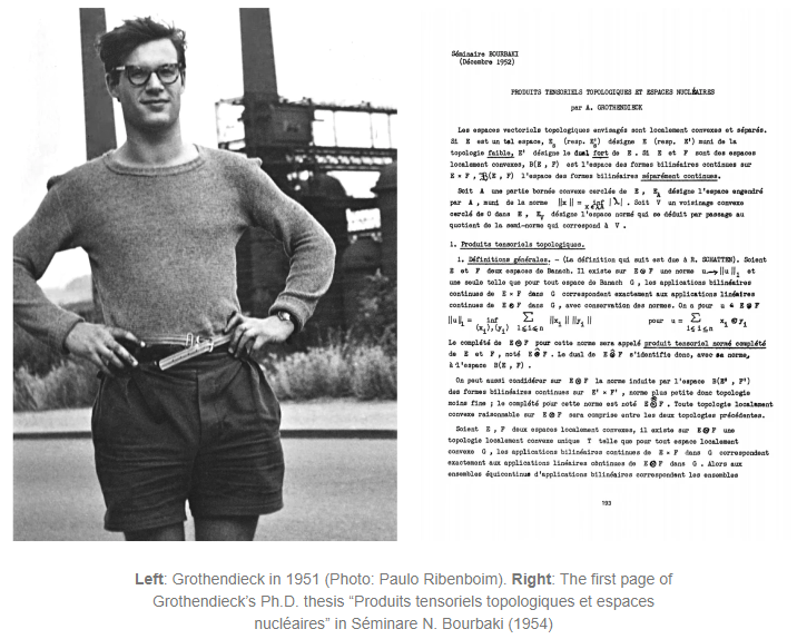 Left: Grothendieck in 1951 (Photo: Paulo Ribenboim). Right: The first page of Grothendieck’s Ph.D. thesis “Produits tensoriels topologiques et espaces nucléaires” in Séminare N. Bourbaki (1954)