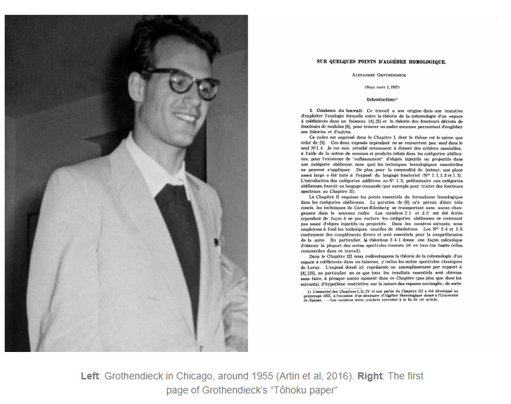Left: Grothendieck in Chicago, around 1955 (Artin et al, 2016). Right: The first page of Grothendieck’s “Tôhoku paper”