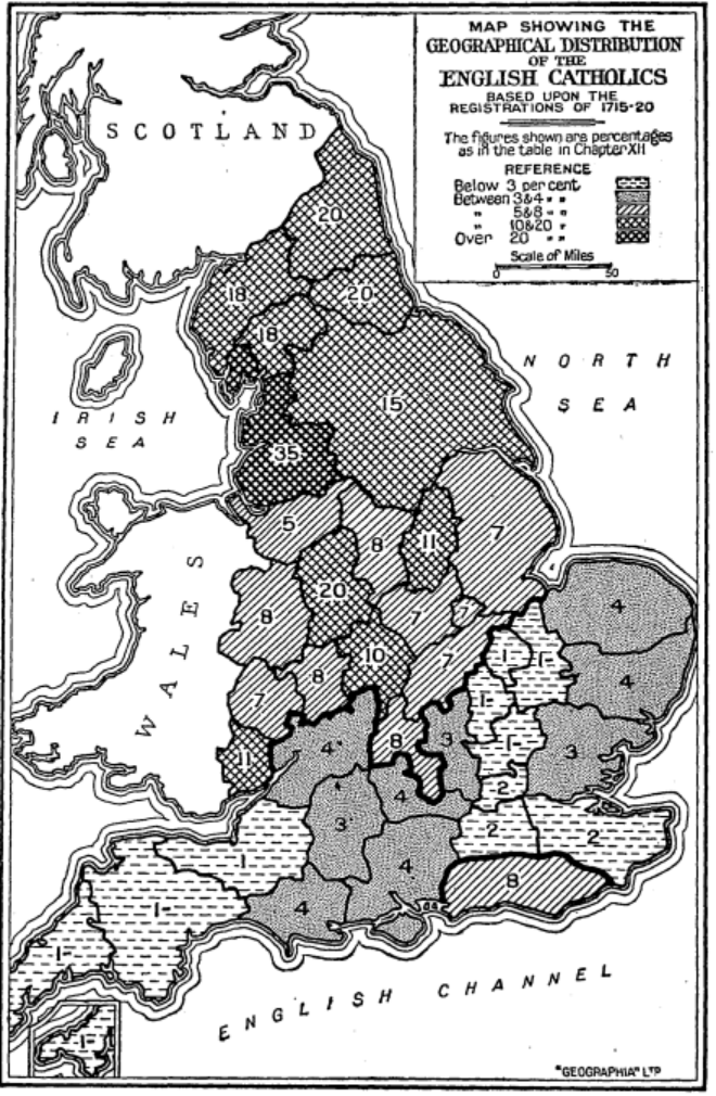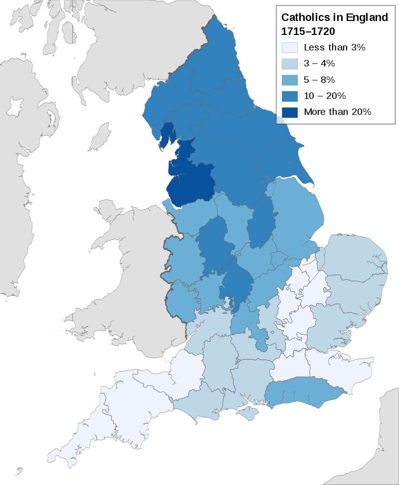 Map of the historic counties of England showing the percentage of registered Catholics in the population in 1715–1720.