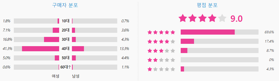 한 온라인 서점을 보내, 여성 40대가 전체 구매자의 41.3%, 40대 남자가 13.3%이다.