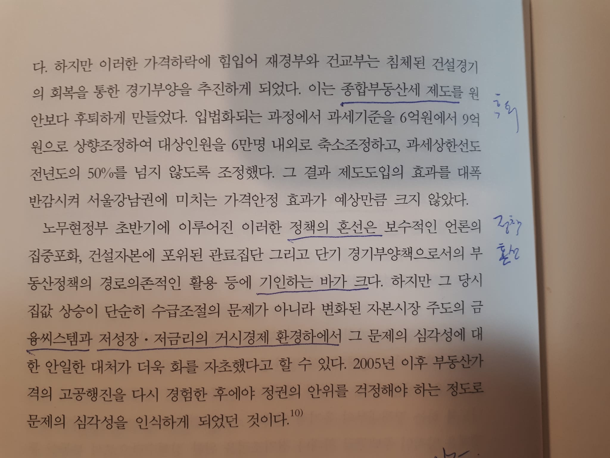 p.170. “종합부동산세 제도를 원안보다 후퇴하게 만들었다. 입법화되는 과정에서 과세기준을 6억원에서 9억원으로 상향조정하여 대상인원을 6만명 내외로 축소조정하고, 과세 상한 선도 전년도의 50%를 넘지 않도록 조정했다. 그 결과 제도도입의 효과를 대폭 반감시켜 서울강남권에 미치는 가격안정 효과가 예상만큼 크지 않았다 (정준호,2008)”