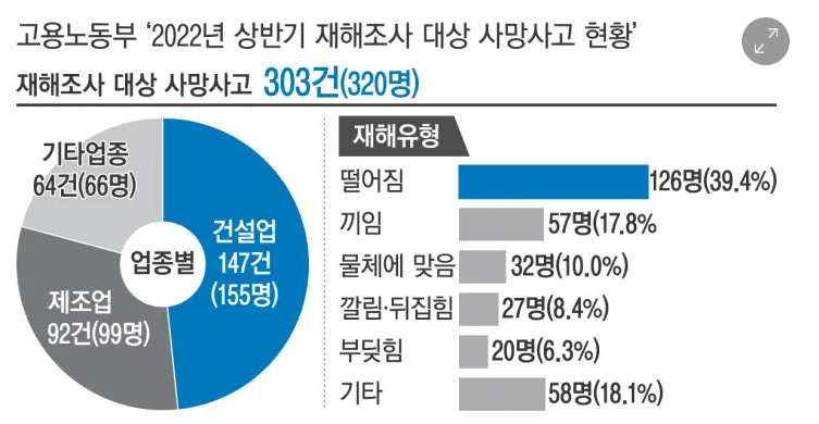 고용노동부가 19일 발표한 ‘2022년 상반기 재해조사 대상 사망사고 현황’을 보면, 올해 상반기에 303건의 업무 관련 사망사고가 일어나 노동자 320명이 숨졌다.