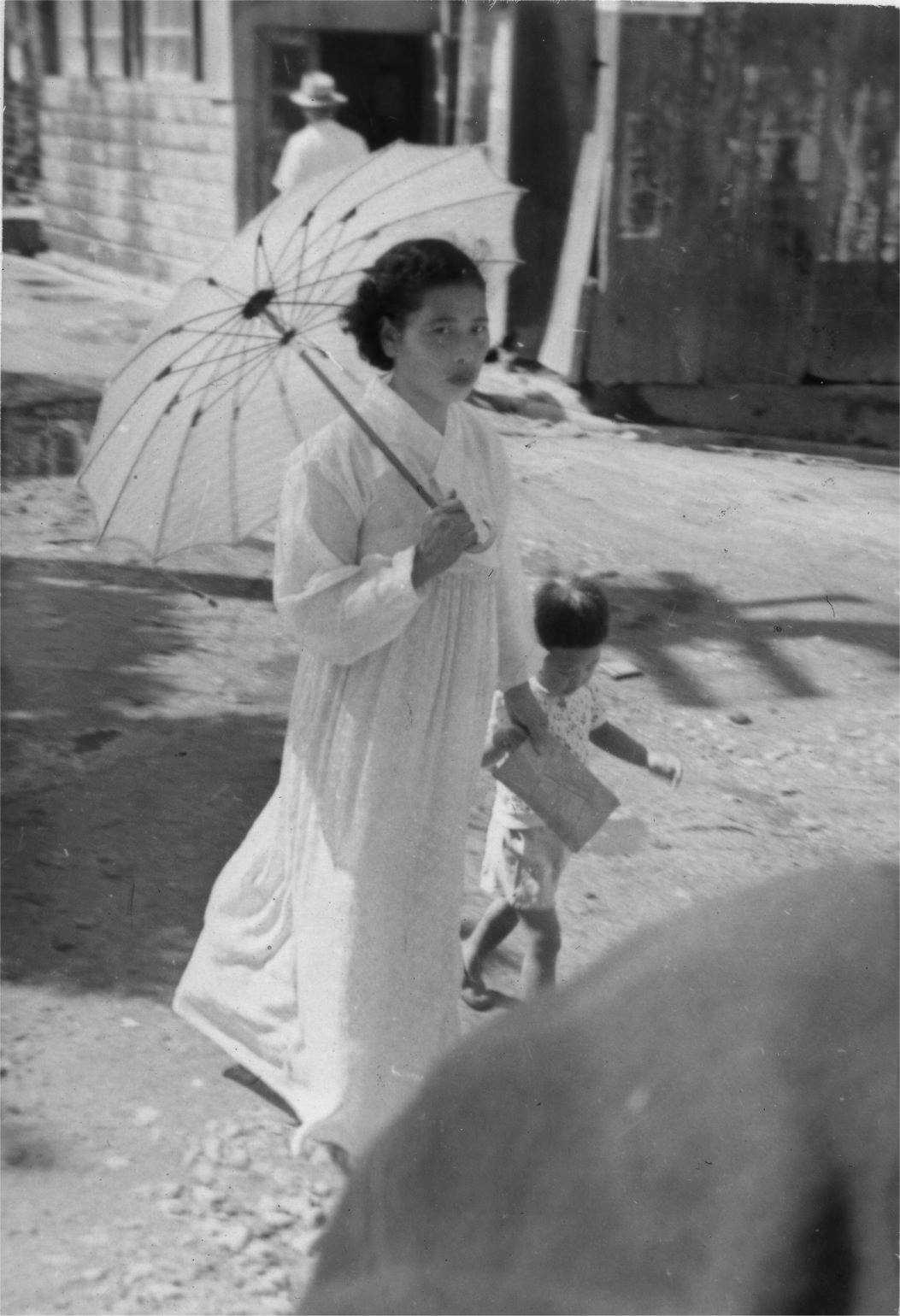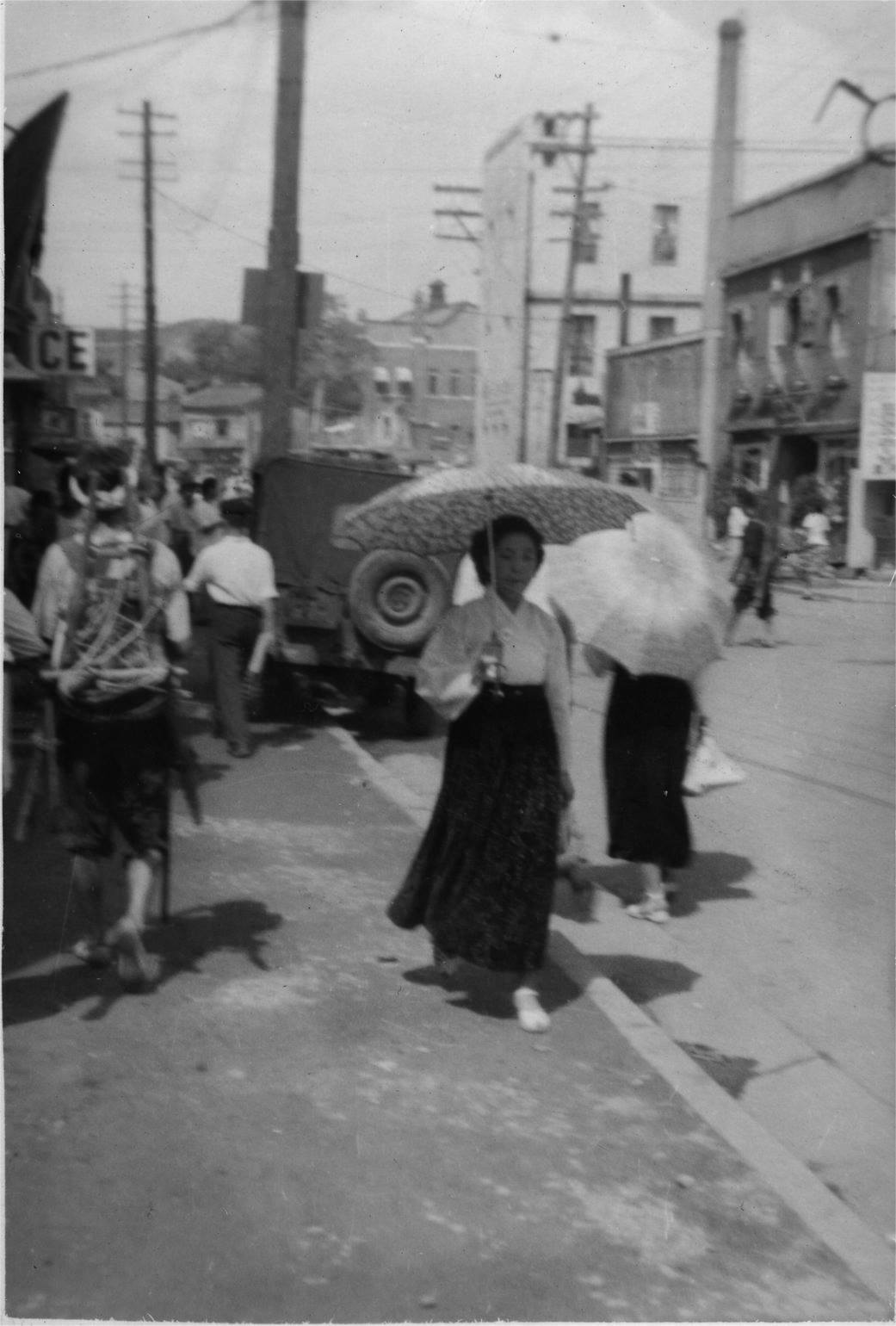 한국 전쟁 당시. 한 여인이 양산을 쓰고 가고 있다.