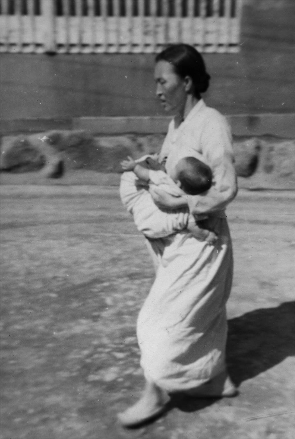 A Korean woman with her child, fleeing from fighting around Seoul,