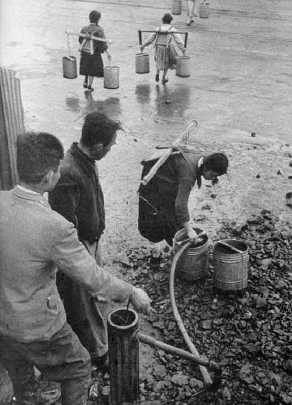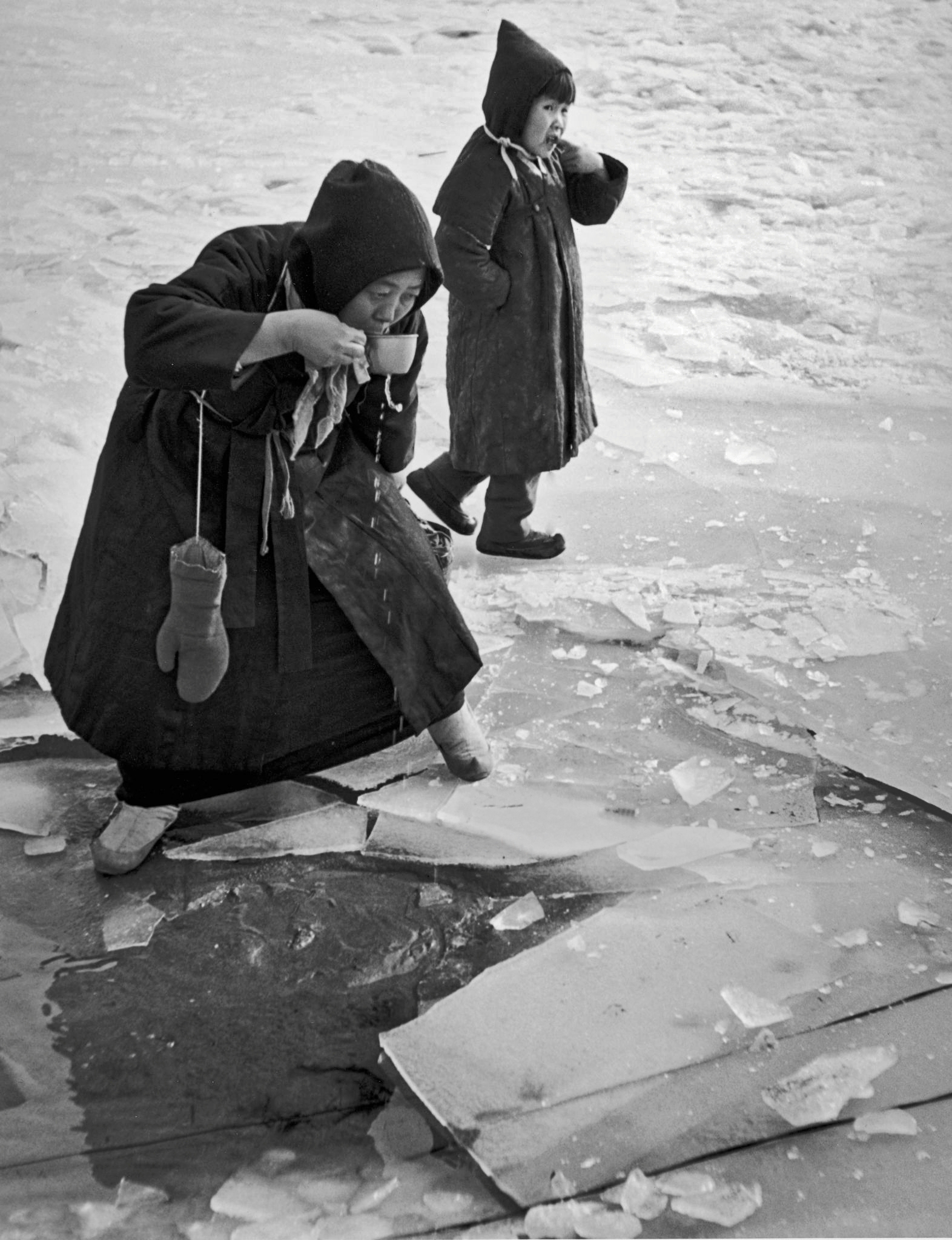 한국 전쟁 당시, 서울 한강, 얼음물을 마시는 한 어머니.