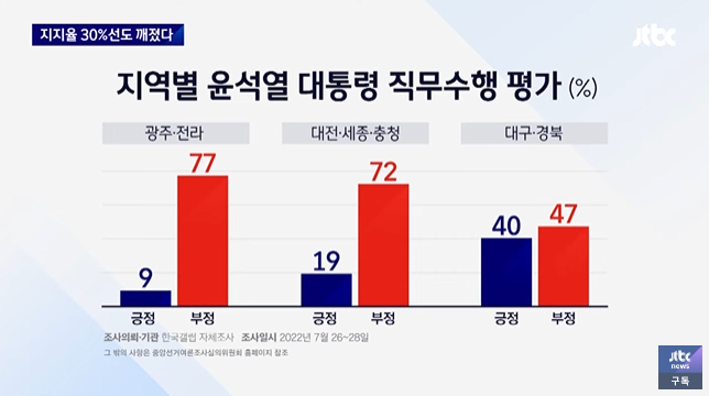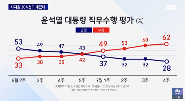 첫 20%대 지지율…대통령실 "일희일비 않고 국민만 보고 열심히" [JTBC] 입력 2022-07-29 19:38