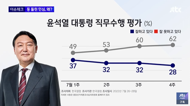 이슈체크] 대통령 태도도 논란…하락 원인 대부분 '내부 요인' [JTBC] 입력 2022-07-29 19:48 수