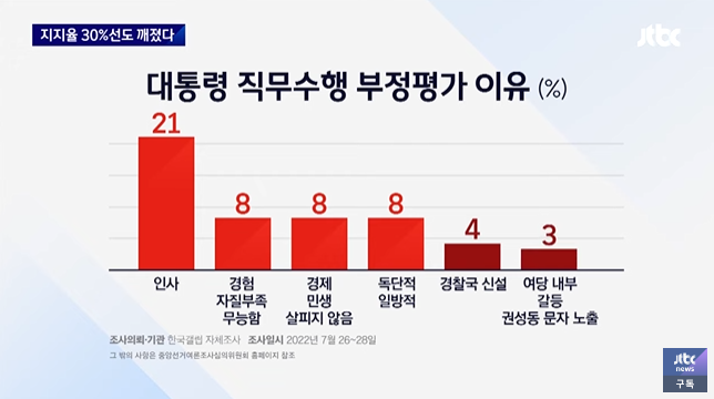 지지율 50→40→30% 깨질 때마다 '인사 문제' 있었다 [JTBC] 입력 2022-07-29 19:45 [앵커]