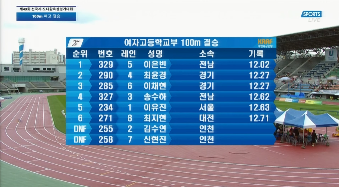 news/스포츠 100m 한국 여고 기록. 2022년. 이은빈 12.02. 최윤경 12.27, 이채현 12.27 by 원시 2022. 7. 30. 100m 한국 여고 기록. 2022년. 문화체육관광부장관기 제43회 전국시·도대항육상경기대회 (1일차) 여고 100m 결승 이은빈 12.02. 최윤경 12.27, 이채현 12.27 송수하 12.62, 이유진 12.63, 최지현 12.71 출발선 동작이 멋있는 100미터 달리기. 공유하기 게시글 관리 한국정치 노트 Notes on the Politics of Korea 저작자표시 변경금지 (새창열림) 'news > 스포츠' 카테고리의 다른 글 잠실 야구장 테러, 폭발물 설치 해프닝. 한국에서 '테러'가 거의 불가능한 이유. 1000명 당 군사인구, 세계 북한 1위 (306명), 한국 2위 (130명) (1) 2022.08.07 [야구] 67년간 다저스 야구팀 중계자, 빈 스컬리 94세 별세. 선수가 아닌 야구 중계자로서 전 야구인들의 추모. (0) 2022.08.05 여자 운동권리 보장. 여자 축구를 바라보는 잘못된 관점들 (0) 2022.08.03 high jump. 높이뛰기 기록. Qatar's Mutaz Essa Barshim 2m 37,Woo Sang-hyeok of South Korea , 2m 35 (0) 2022.07.19 육상 800m, 남자고등부. 김지환 (양정고) 1:55.49, 김진만 (총현고) 1:55.77, 김세현 (은행고) 1:56.68 (0) 2022.07.17 육상 - 달리기. 800 m 경기체고 박서연 (경기체고) 2:20.58, 양경정 (전곡고) 2:23.91, 금서영 (대구체고) 2:26:08 (0) 2022.07.17 손흥민 시합날,밥을 먹으면 체한다. 부친 손웅정씨 인터뷰 "기본기없이 이기는 축구하다가 몸이 망가져 " 28세 은퇴. 유소년 축구 중요성. (0) 2022.07.17 관련글 [야구] 67년간 다저스 야구팀 중계자, 빈 스컬리 94세 별세. 선수가 아닌 야구 중계자로서 전 야구인들의 추모. 여자 운동권리 보장. 여자 축구를 바라보는 잘못된 관점들 high jump. 높이뛰기 기록. Qatar's Mutaz Essa Barshim 2m 37,Woo Sang-hyeok of South Korea , 2m 35 육상 800m, 남자고등부. 김지환 (양정고) 1:55.49, 김진만 (총현고) 1:55.77, 김세현 (은행고) 1:56.68