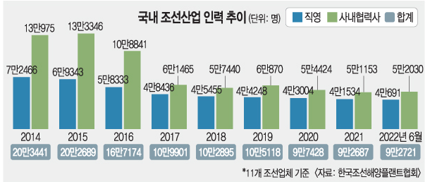 한국조선해양플랜트협회에 따르면 지난달 말 기준으로 한국의 조선업계 인력은 원·하청을 통틀어 9만2721명에 불과하다. 2014년(20만3441명)과 비교하면 10만명 넘게 줄었다.