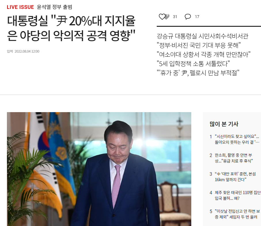 | 윤석열 지지율 급락 원인들. 훈련된 개인기 부족. 실권자들 제어못해 (0) | 2022.08.01 |