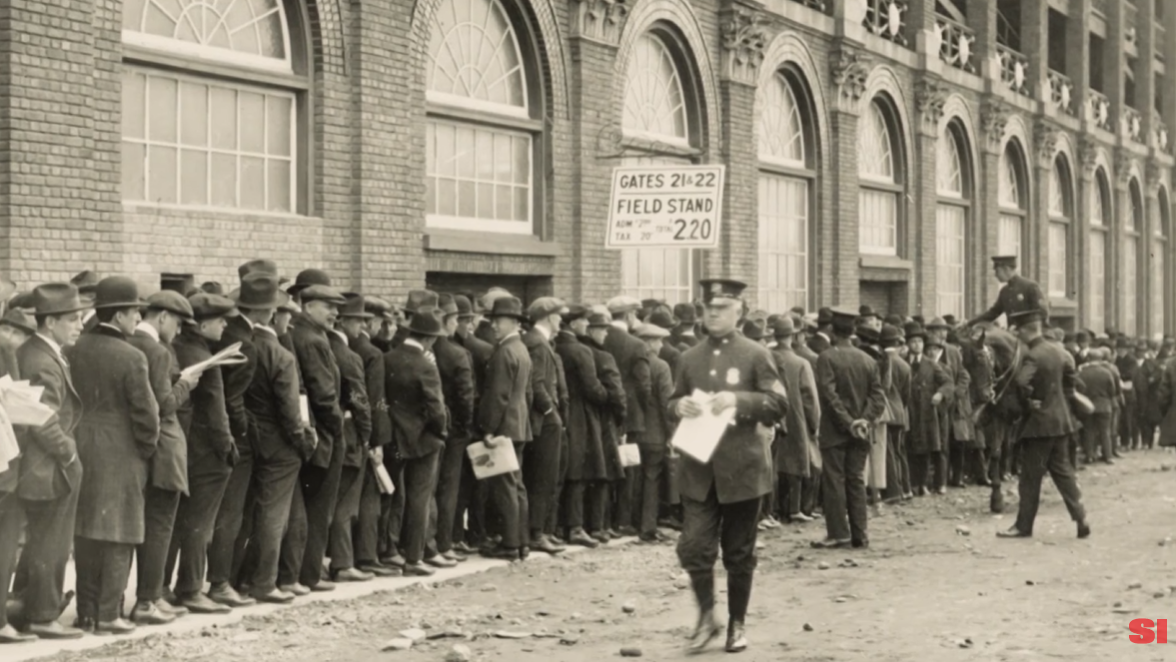 브룩클린 다저스 야구 경기를 보기 위해 팬들이 에베츠 필드 앞에 줄을 선 광경.