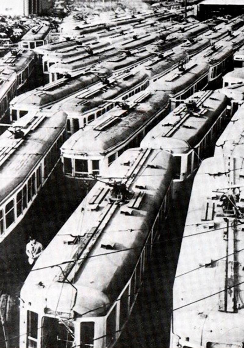 1968년 11월 29일 운행 70년 만에 폐차 처분되어 차고에몰려있는 서울의 전차